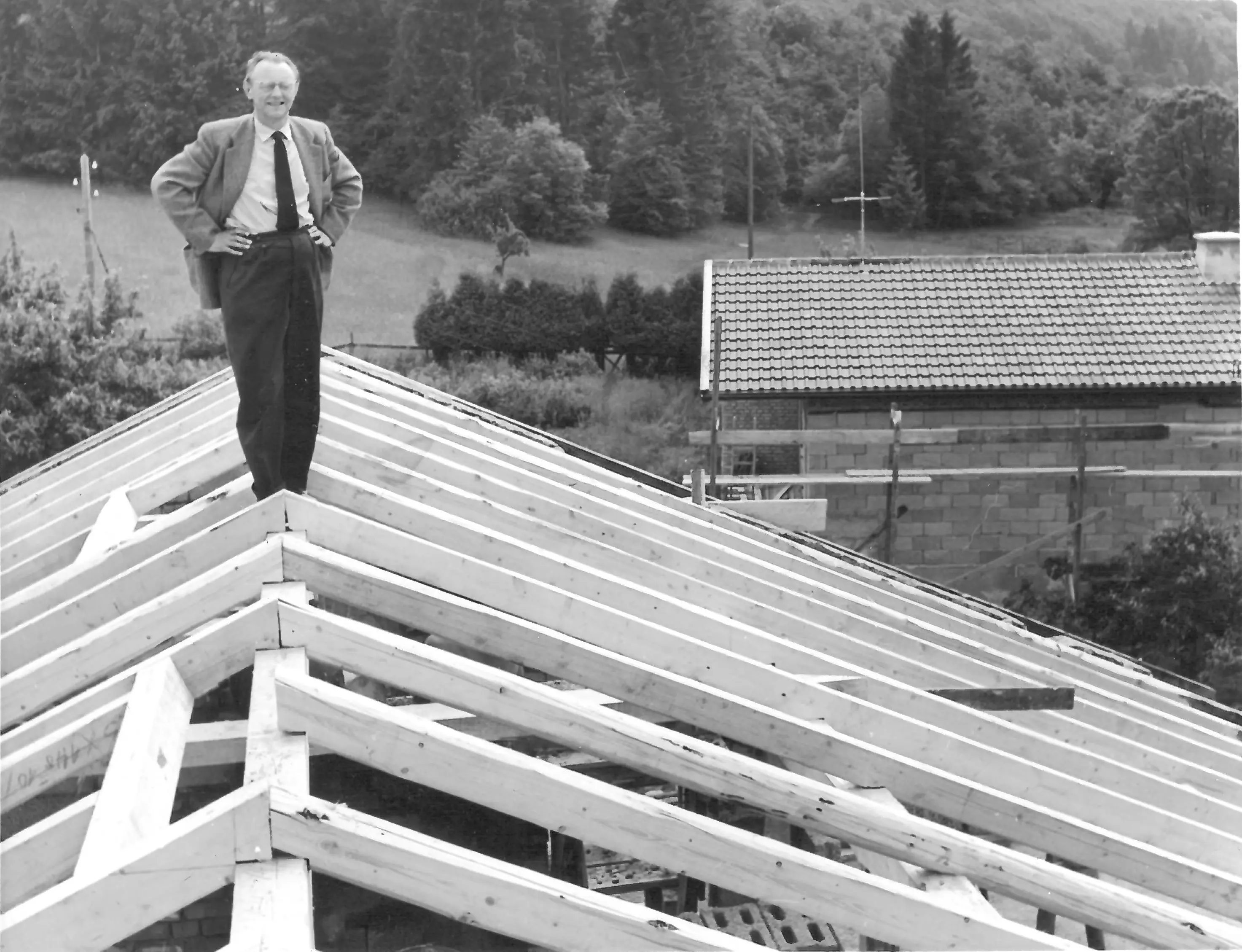A roof for its birthday. The Carl Orff Foundation celebrates 10 July 2024 with a topping-out ceremony. In June, the time had finally come: the new building of the COMU Carl Orff Museum at Ziegelstadel 1 in Dießen got a new roof. Construction workers used two cranes to lift 11 tonnes of vaulted ceiling onto the large exhibition hall. Almost 70 years after Carl Orff himself celebrated the extension of his house at Ziegelstadel 1, another topping-out ceremony took place. Pupils from the Carl Orff School in Dießen opened the celebration with songs. Secretary General Judith Janowski then welcomed those present and expressed her particular thanks to all the sponsors who have generously supported the museum. Last but not least, site manager Torsten Huhle from the contractor Lutzenberger, foreman Christoph Meyer and concrete expert Lukas Schröther gave the topping-out speech and emptied their glasses three times to the applause of the guests: ‘May the museum be a place of knowledge, wonder and inspiration, where history comes alive and knowledge flourishes.’ Following the ceremony, celebrations took place in the courtyard of the Orff estate. Guests were able to enjoy food and drink. At an improvised table with instruments and playing cards, they had the opportunity to test a hands-on station of the future museum for the first time and sing a birthday song to Carl Orff. Fotos: Michael Tschuschner und COMU | COS Richtfest 1955 Bauarbeiter stehen auf dem Dachstuhl, am Giebel ist ein geschmücktes Bäumchen © COS Carl Orff auf dem Dachstuhl Carl Orff steht im Anzug auf dem Dachstuhl seines Hauses. © COS Das Museum bekommt ein Tonnendach Mit dem Kran wird ein Tonnenteil in ein modernes Gebäude eingesetzt. © COS Der erste Schritt fürs Dach ist gemacht! Alle Betonteile sind verbaut Ein modernes Betongebäude mit mehreren halbmondförmigen Kuppeln am Giebel. © COS Die Richtkrone An einem Baukran hängt eine große grünumwundene Krone. © COS Kinder singen ein Ständchen zum Richtfest Kinder singen und spielen auf Xylosphonen. © Foto: Michael Tschuschner Die Bauleute sprechen den Richtspruch Über den Rand eines Betongebäudes im Rohbau ragen drei Köpfe mit Helmen. © Foto: Michael Tschuschner Buffet fürs Richtfest Auf einem Buffet stehen Platten mit Essen und Blumendeko und Tellerstapel. © COS Ein Geburtstagsständchen für Carl Orff Frauen stehen an einem Tisch mit vielen Instrumenten und machen Musik. © COS Artikel in News • 19. Jul 2024 Teilen Twitter Facebook LinkedIn